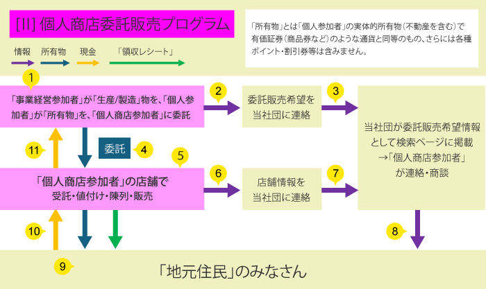 (1)「生産/製造」物を販売したい「事業経営者」と「所有物]を売りたい「個人」の方が、若者向けの廉価な販売を、委託販売店を運営し地域に貢献する「個人商店」に委託し、若者の収入増と地域産業の活性化や地域生活の継続を図るプログラムです。