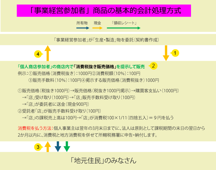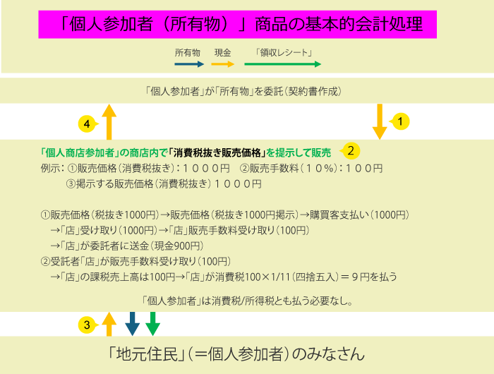 *受託者の「店」が消費税を払う方法:個人事業者は翌年の3月末日までに、法人は原則として課税期間の末日の翌日から2か月以内に、消費税と地方消費税を併せて所轄税務署に申告・納付します。 - 販売出来なかった委託品の廃棄・返却などは受託者である「個人商店」の判断で行うものとします。