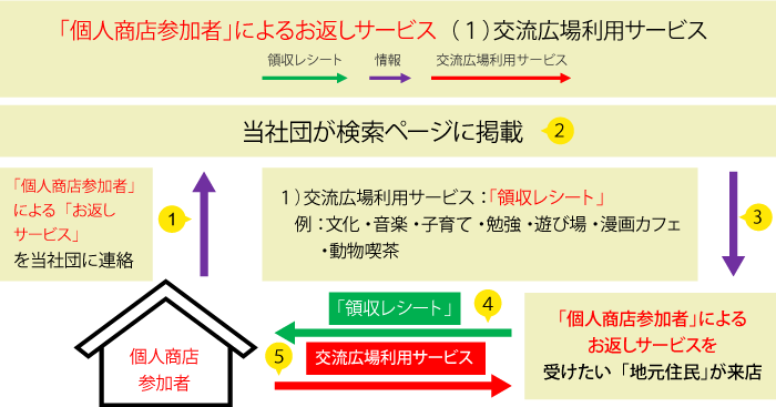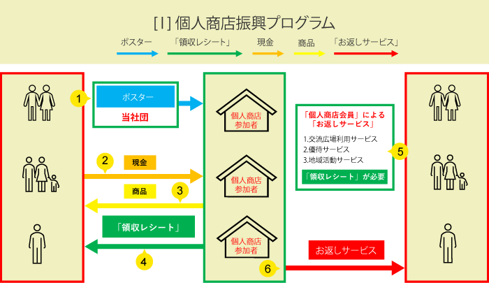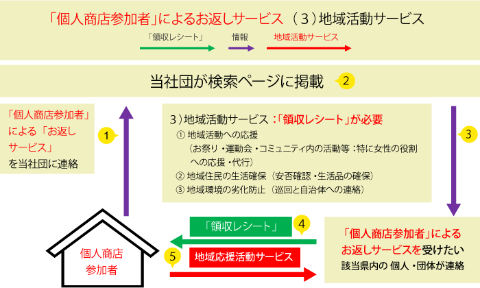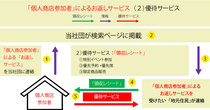 [⑤] 各地元住民は個人商店の「領収レシート」の提示により3種類の「お返しサービス」を受けられる。